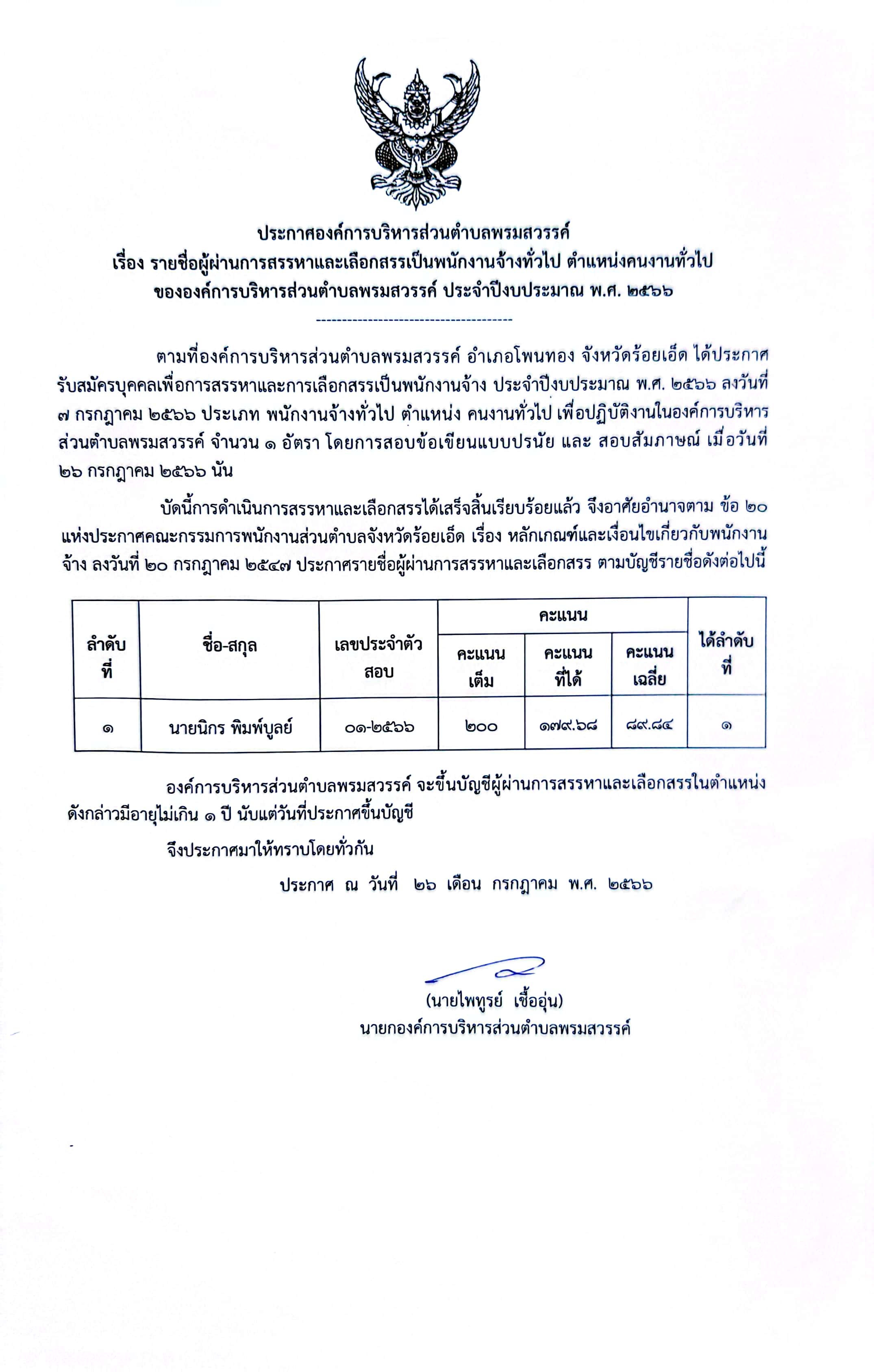 ประกาศรายชื่อผู้ผ่านการสรรหาและเลือกสรรเป็นพนักงานจ้างทั่วไป