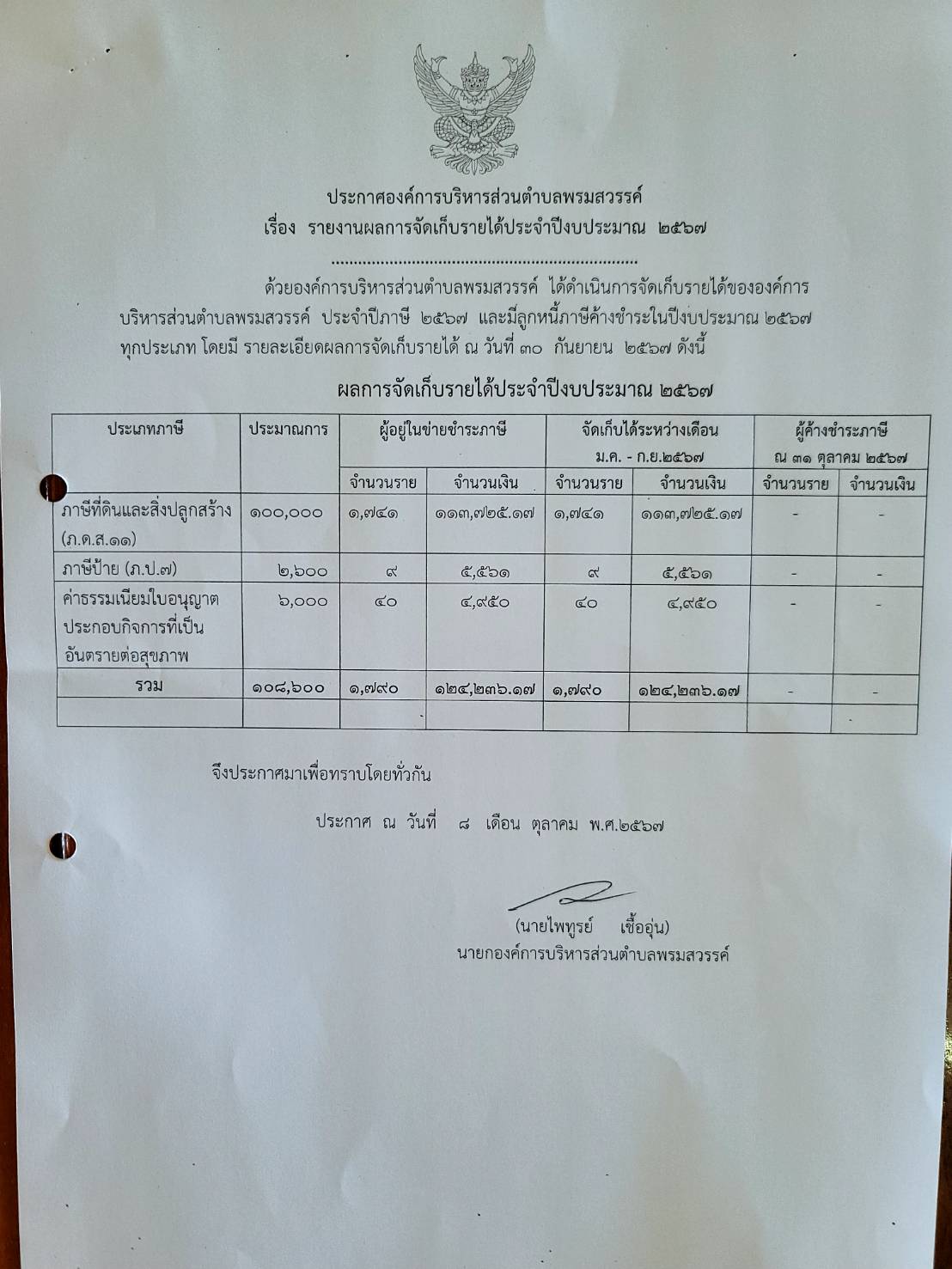 ประกาศองค์การบริหารส่วนตำบลพรมสวรรค์ เรื่อง รายงานผลการจัดเก็บรายได้ประจำปีงบประมาณ 2567