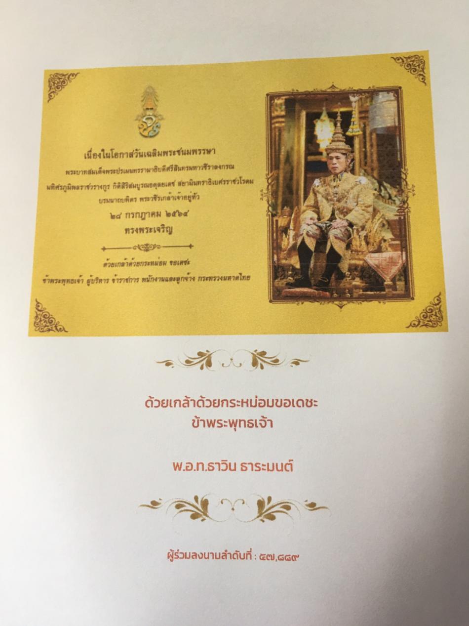 ขอเชิญชวนร่วมลงนามถวายพระพรเนื่องในโอกาศวันเฉลิมพระชนมพรรษา พระบาทสมเด็จพระปรเมนทรรามาธิบดีศรีสินทรมหาวชิราลงกรณ มหิศรภูมิพลราชวรางกูรกิติสิริสมบูรณอดุลยเดช สยามินทราธิเบศรราชวโรดม บรมนาบพิตร... [27 กรกฎาคม 2564]