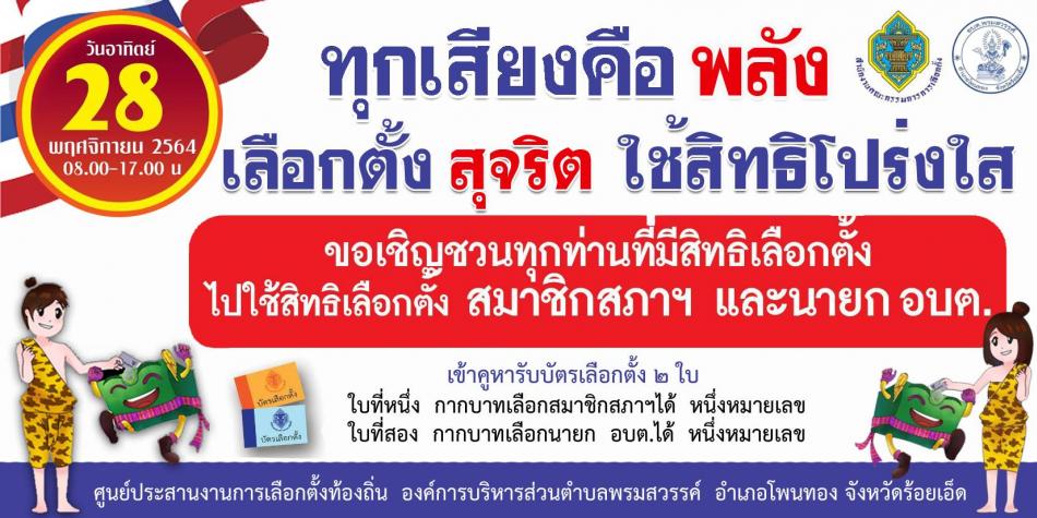 ขอเชิญชวนทุกท่านที่มีสิทธิเลือกตั้งไปใช้สิทธิเลือกตั้งสมาชิกสภาฯและนายก อบต #ทุกเสียงคือพลัง #เลือกตั้งสุจริต #ใช้สิทธิโปร่งใส #ในวันอาทิตย์ที่28พฤศจิกายน2564 #เวลา 08.00-17.00น. #เข้าคูหา รับบัตรเลือกตั้ง 2ใบ... [20 ตุลาคม 2564]